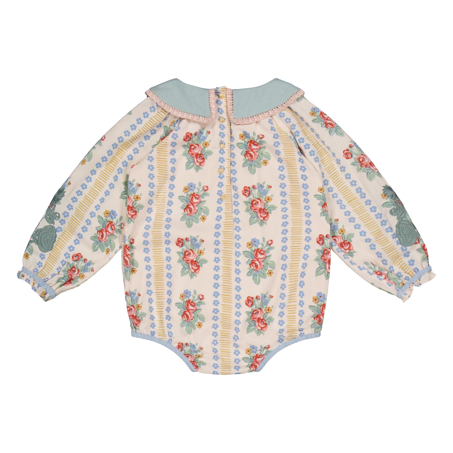 A romper in 100% ECOVERO® Viscose with a hand embroidered and lace trimmed collar and hand embroidery on the sleeves.