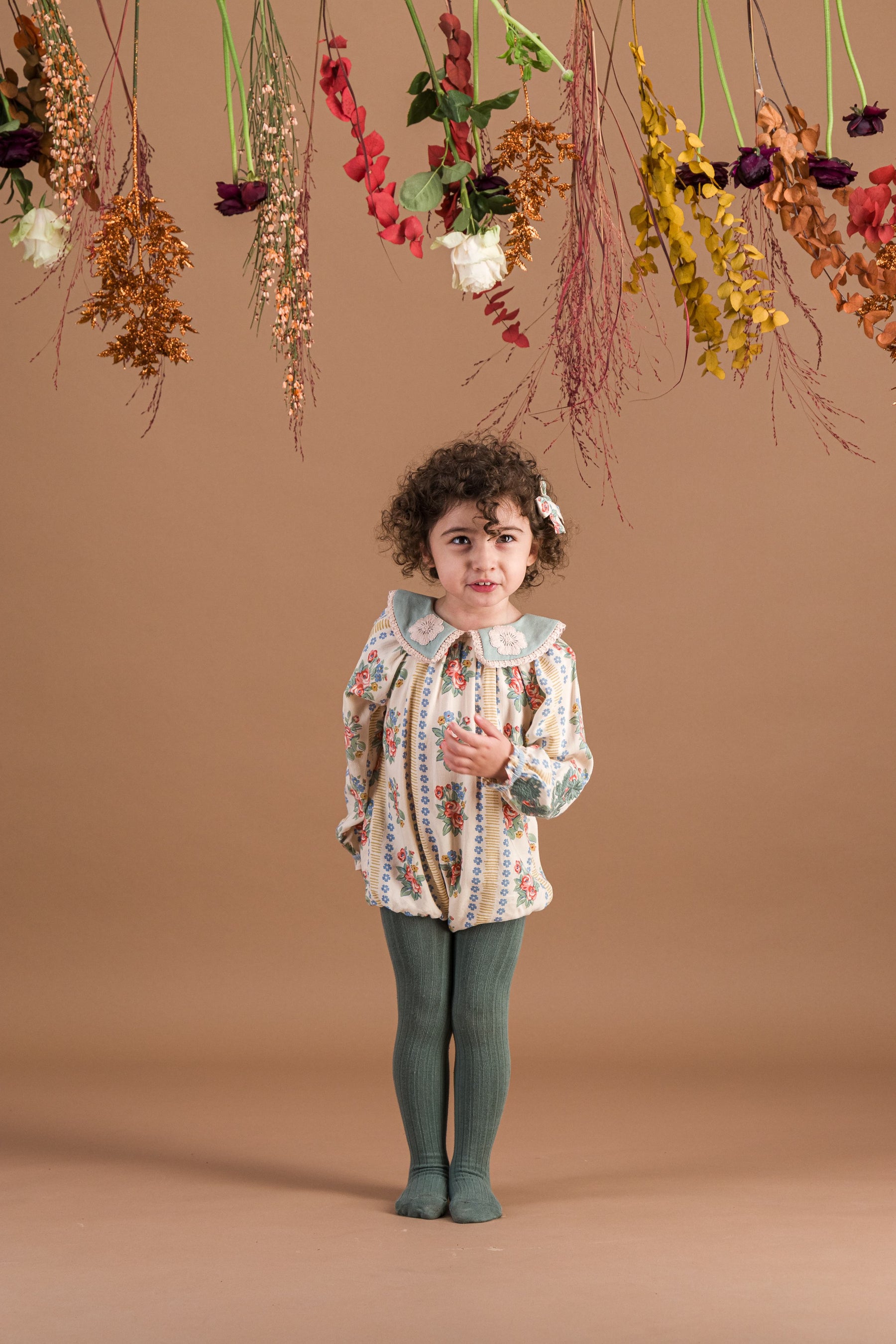 Details: Romper, 100% ECOVERO® Viscose, Block Print, Plain lining in organic cotton voile, Hand embroidery on the collar and sleeves, Lace, Long elasticated sleeves, Golden snap buttons at the crotch, Golden buttons at the back.