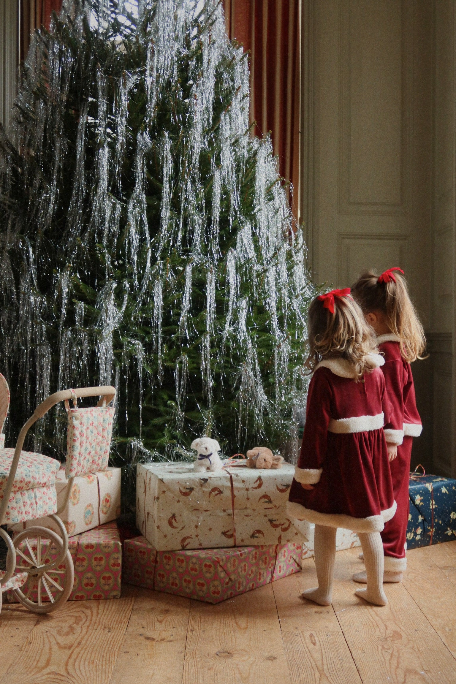 Classic Christmas dress made in soft red velvet with white contrast fabric. This product contains at least 80% GRS certified polyester, certified by CU 1094701
