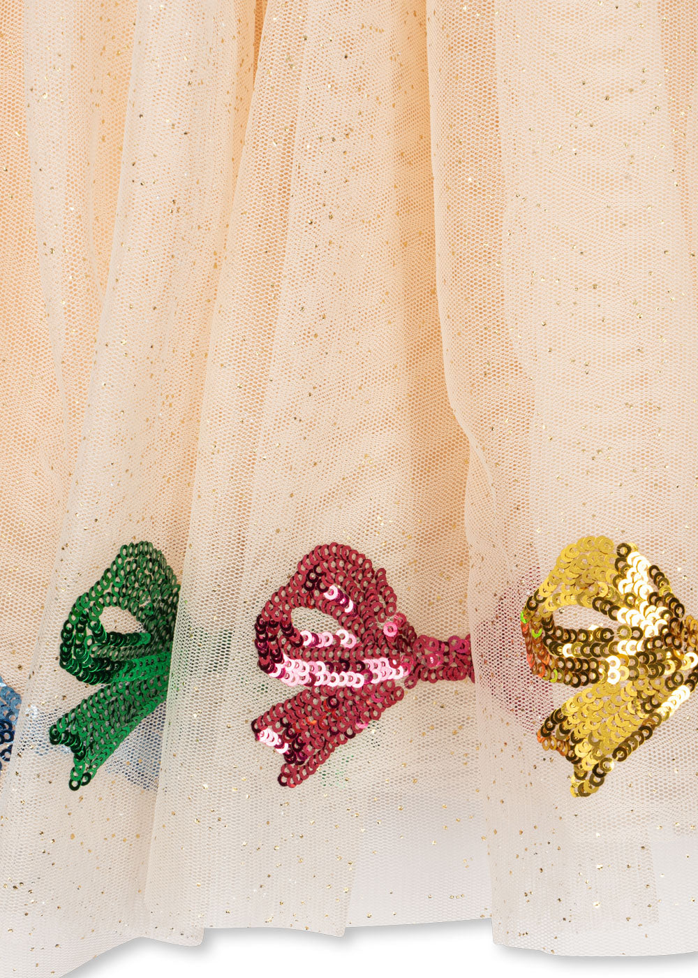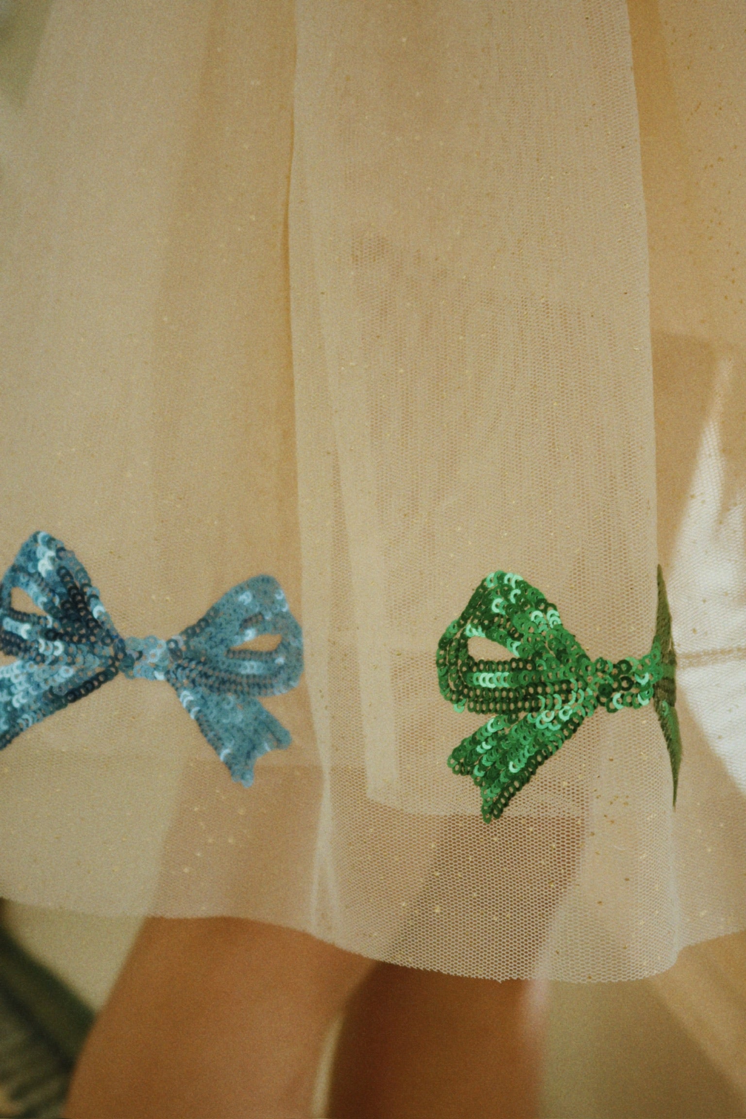 Puff sleeve dress with a sparkly sequin bodice and layered tulle skirt. A festive favorite that fits all occassions. Designed with a button closure in the back.