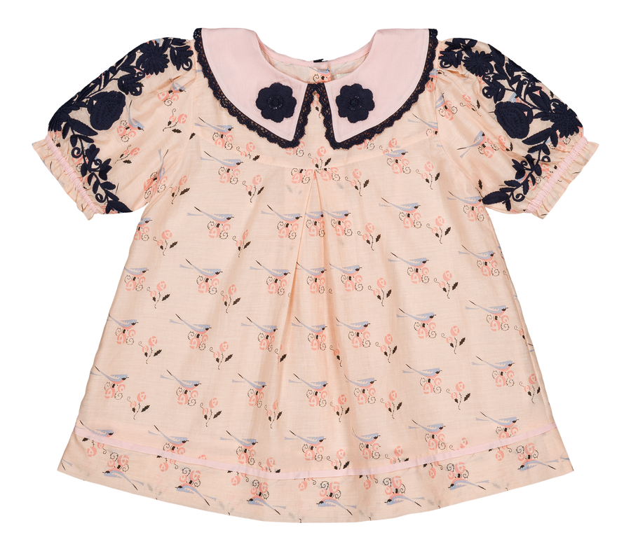 [Bachaa] Bird Print Blouse / Short Dress - Almond Cream