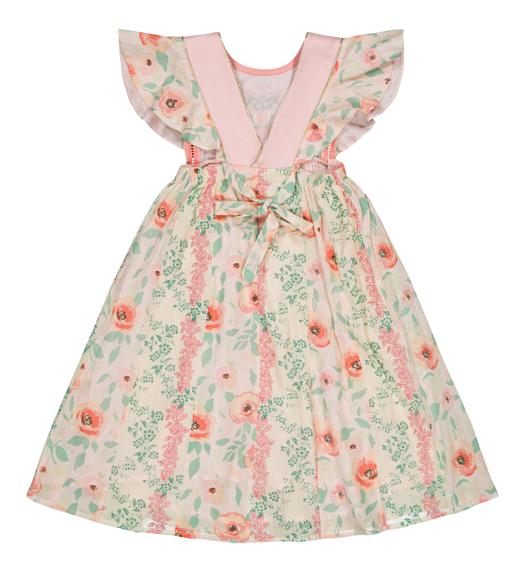 Details: Long dress, 100% organic cotton, Plain lining in organic cotton voile, Double block print, Embroidery, ladder lace and golden piping on the front, Crossed straps at the back, Gathers on the front & back, Ruffled and lined sleeves, Belt at the back.