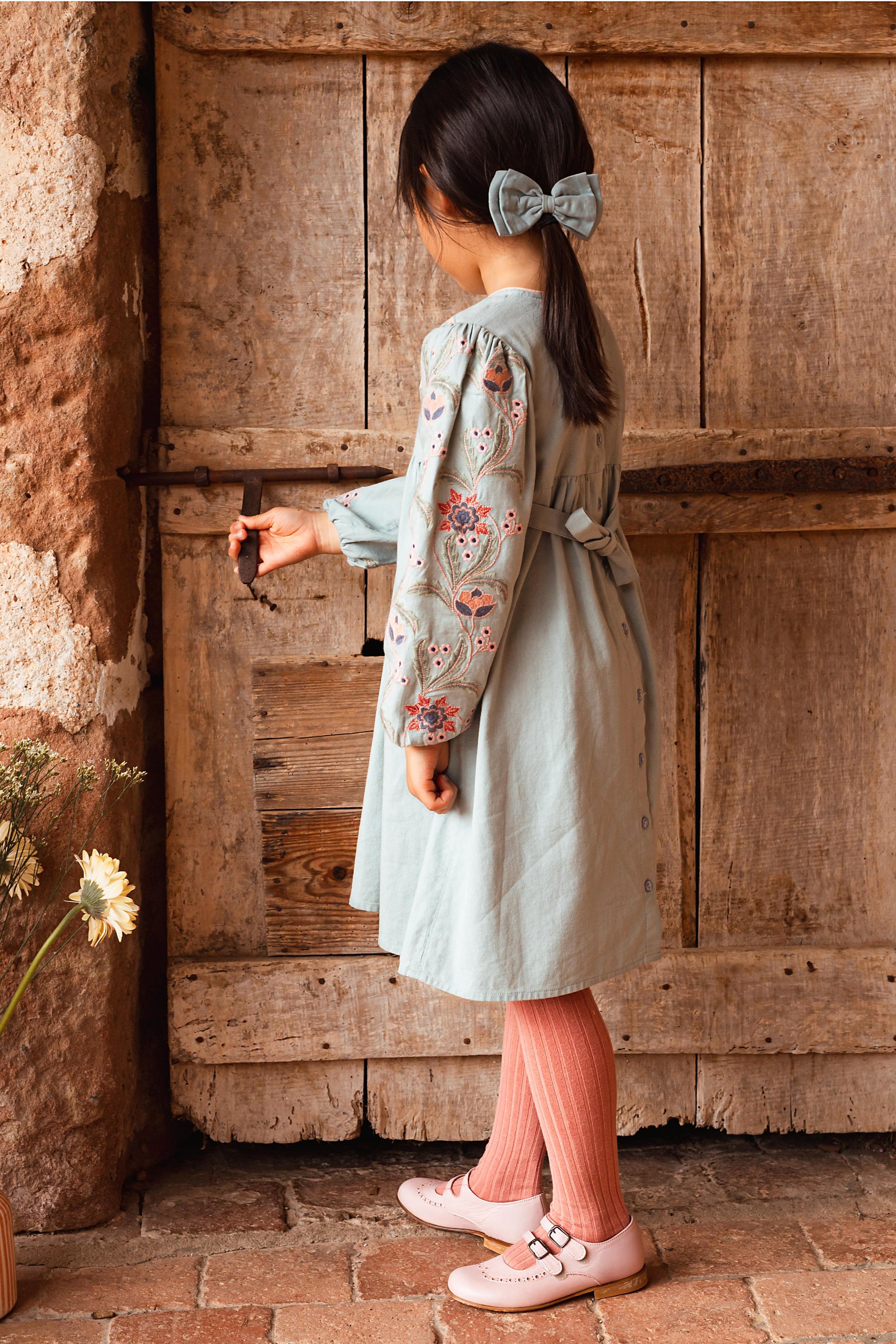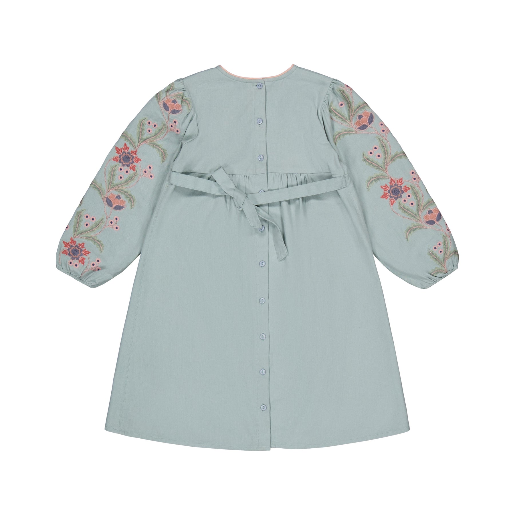 Details: Dress, Blue color, Organic cotton twill (167 g/m²), Plain lining in organic cotton voile, Pintucks, ladder lace and gathers at the front, Long embroidered and elasticated sleeves, Buttons and belt at the back.