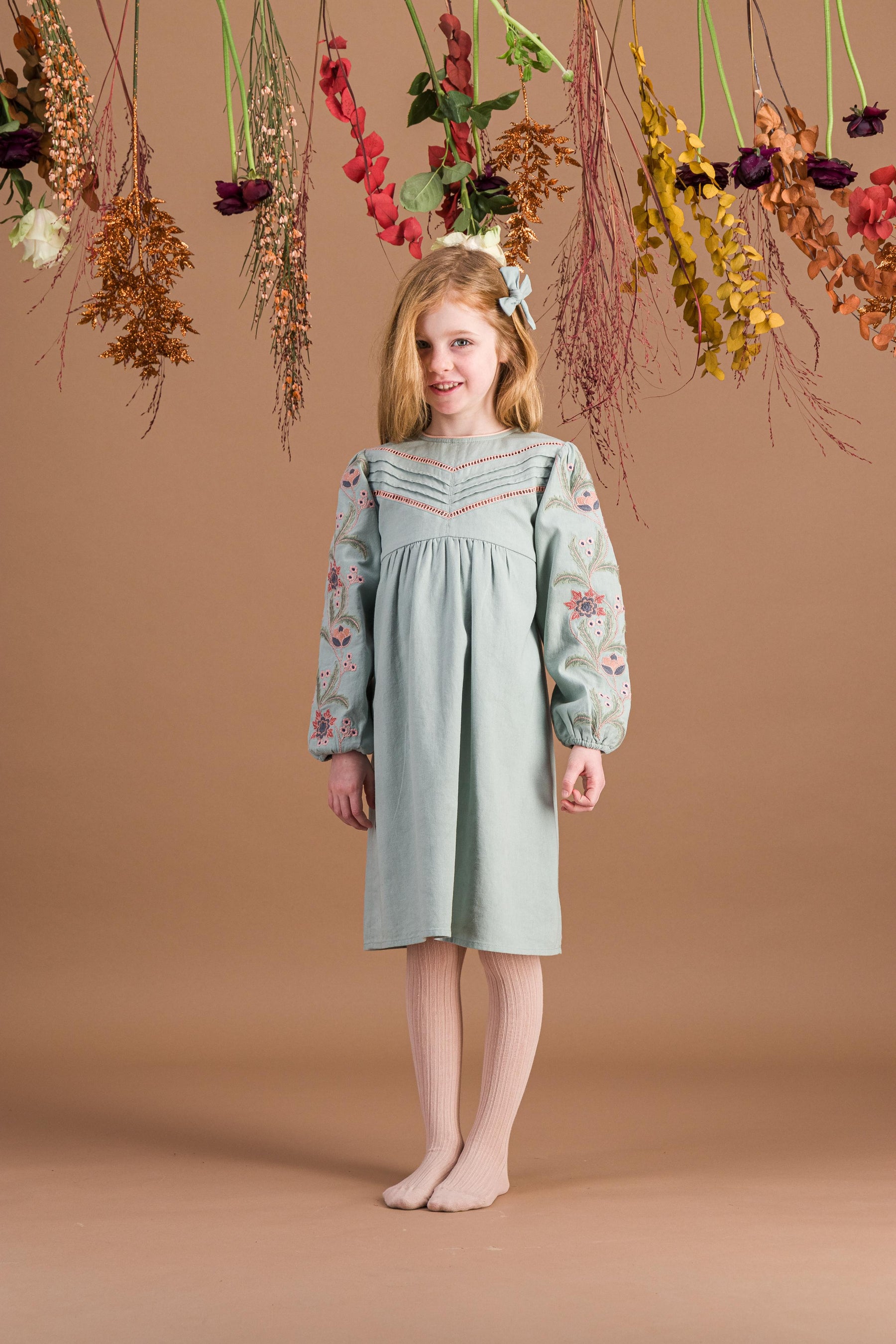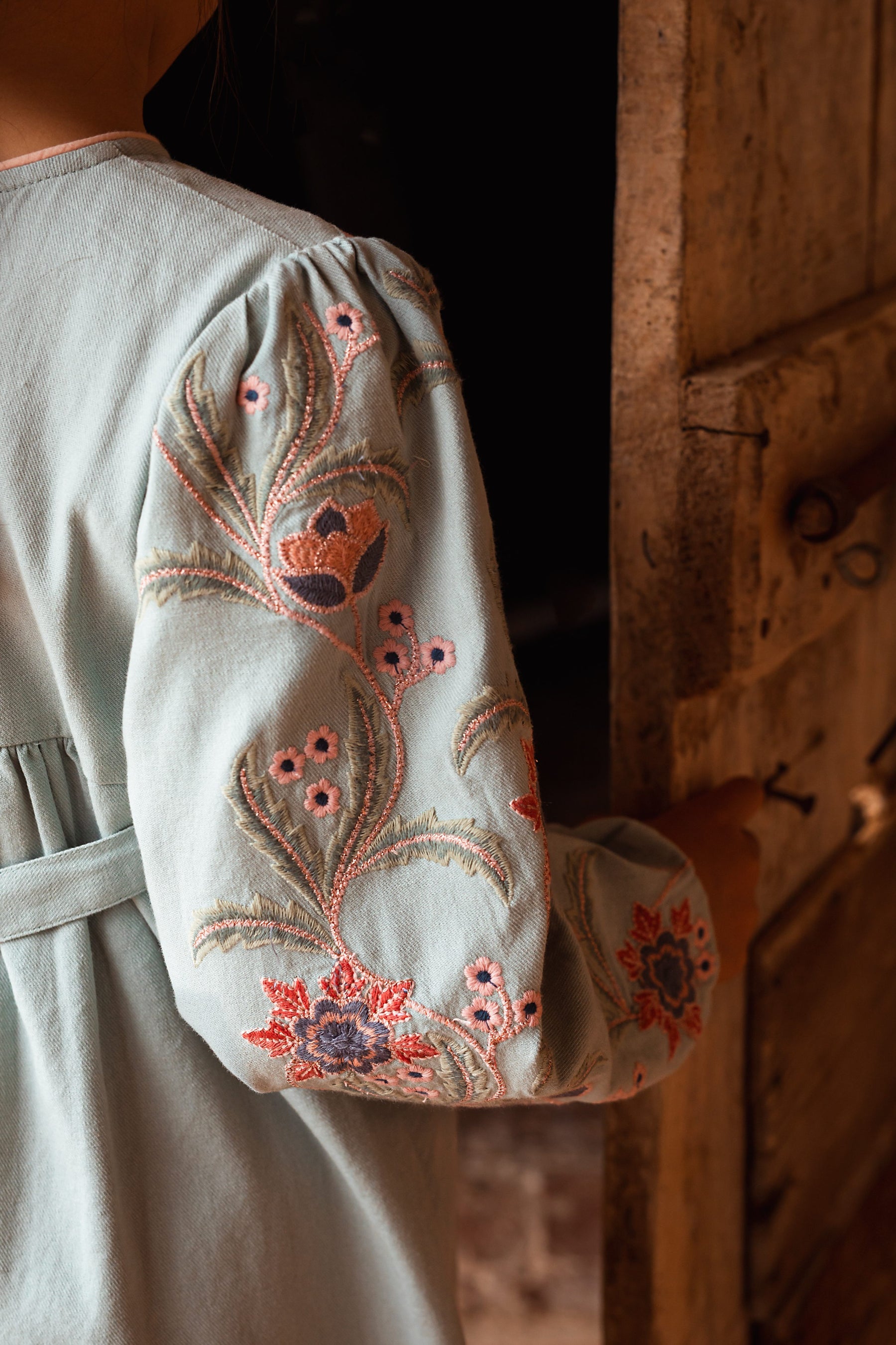 A dress made from heavyweight organic cotton twill (167 g/m²) with fully embroidered sleeves and a front yoke adorned with pintucks and ladder lace.