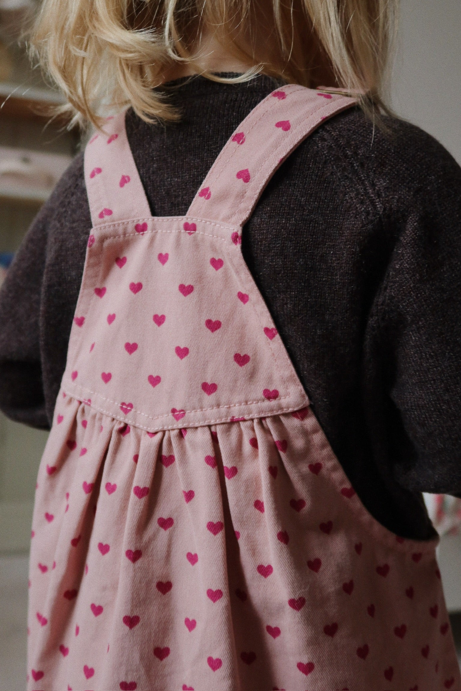 Spencer dress in a heavy cotton quality with classic buckle straps and a decorative sequin attachment in front. Made from 100% organic cotton. GOTS, Organic, certified by CU1094701