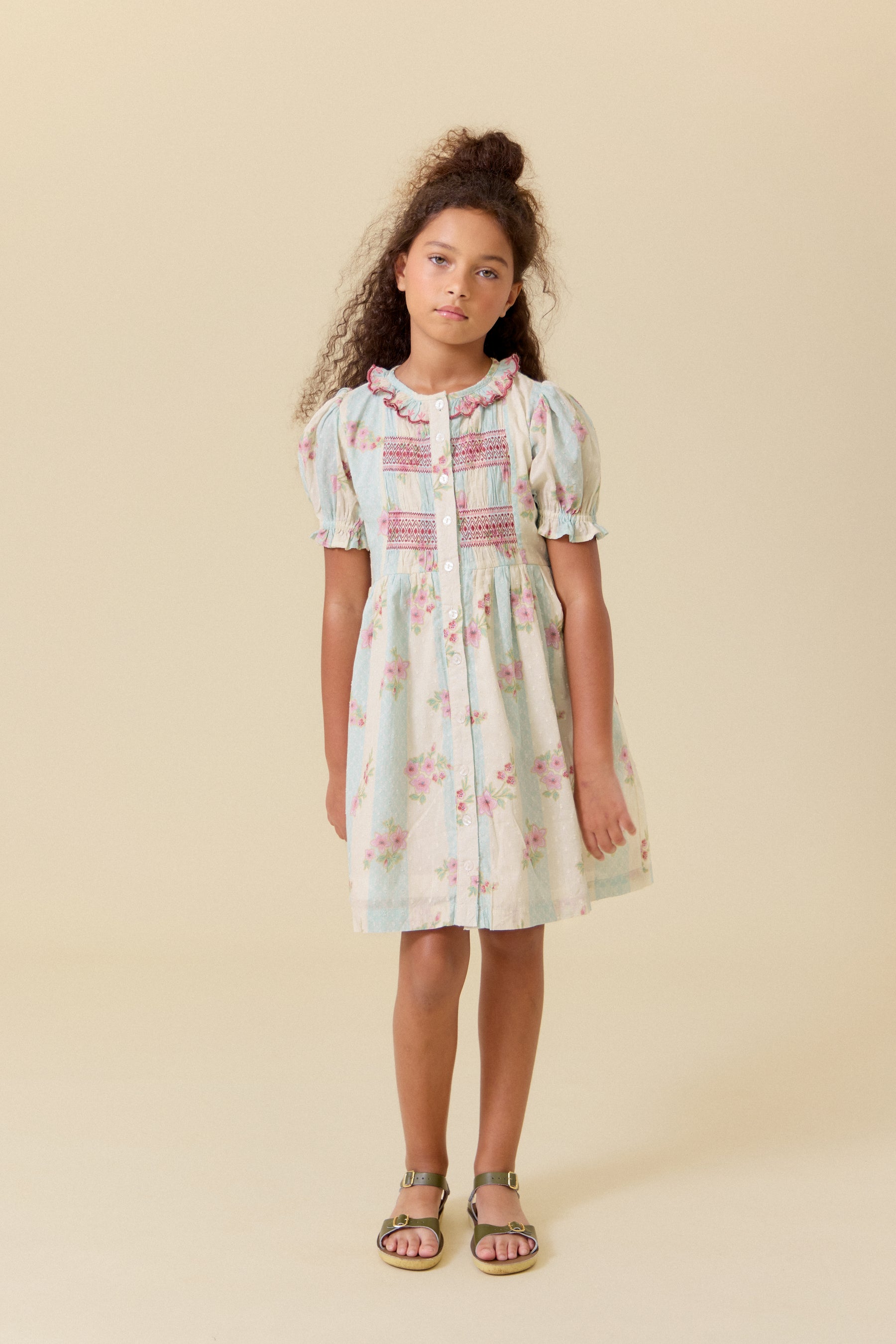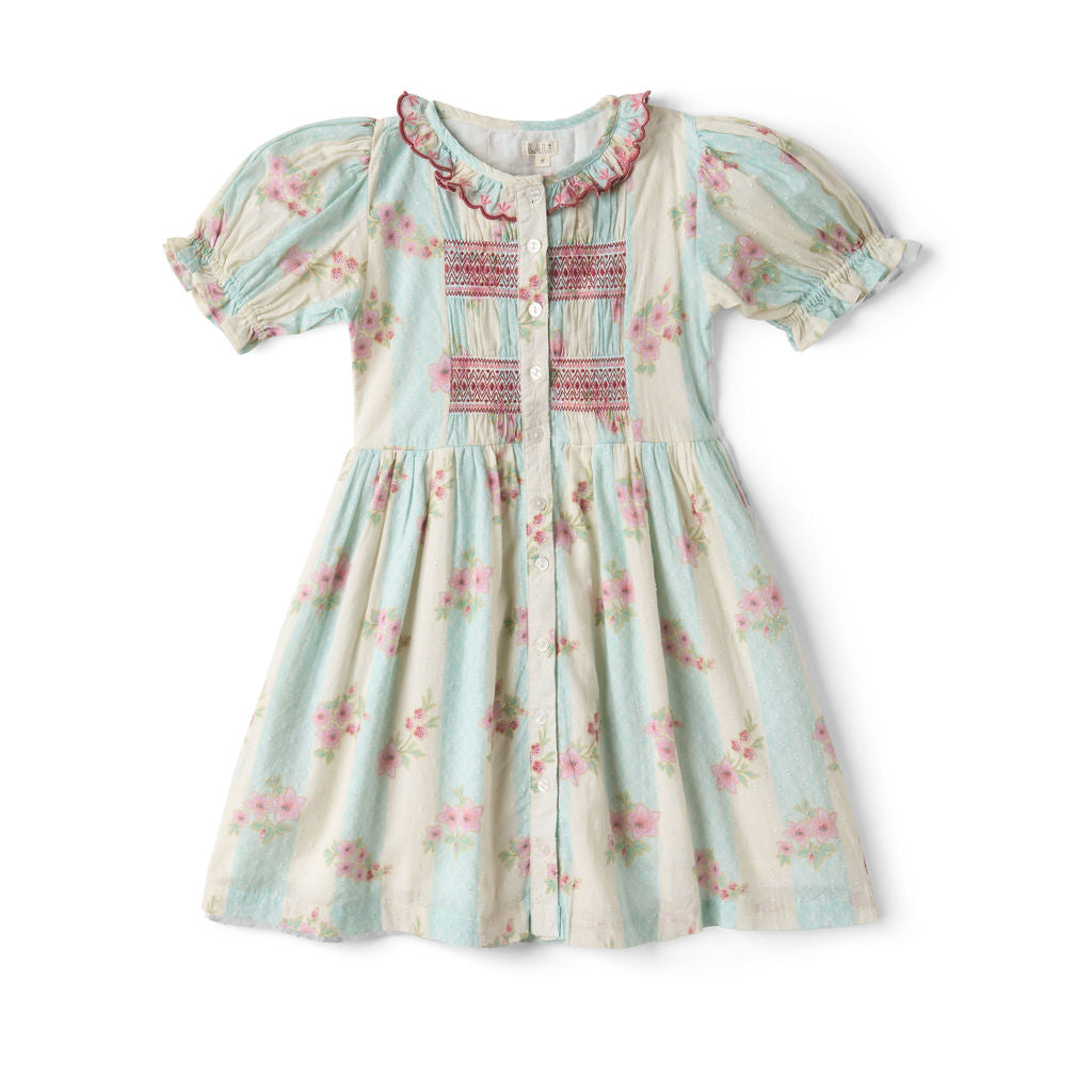 The Ivy Dress in our Minty Stripe print is a charming Lali favorite, designed with relaxed puff short sleeves, a sweet neckline ruffle, and soft smocking through the bodice. The skirt falls just below the knee for an easy, timeless shape, while two embroidered panels frame the mother-of-pearl button placket for an extra heirloom touch. Crafted in our custom-drawn painterly print on 100% Swiss dot dobby cotton and fully lined for comfort, Ivy is made for spring celebrations and everyday days that feel a little special.