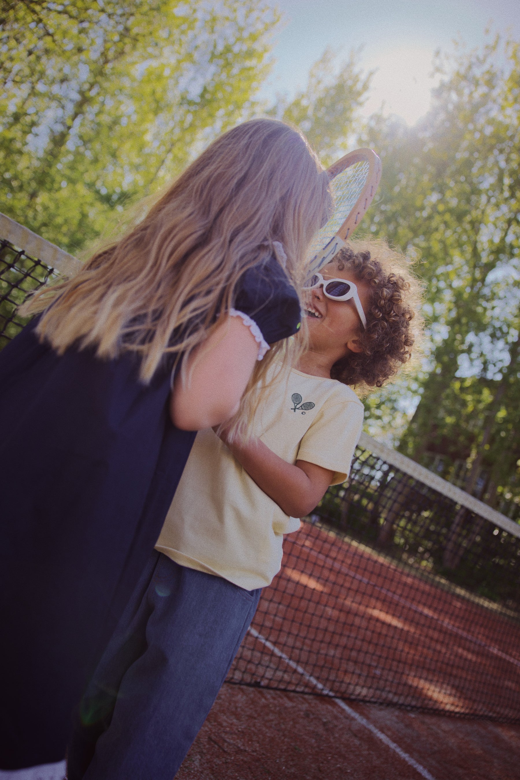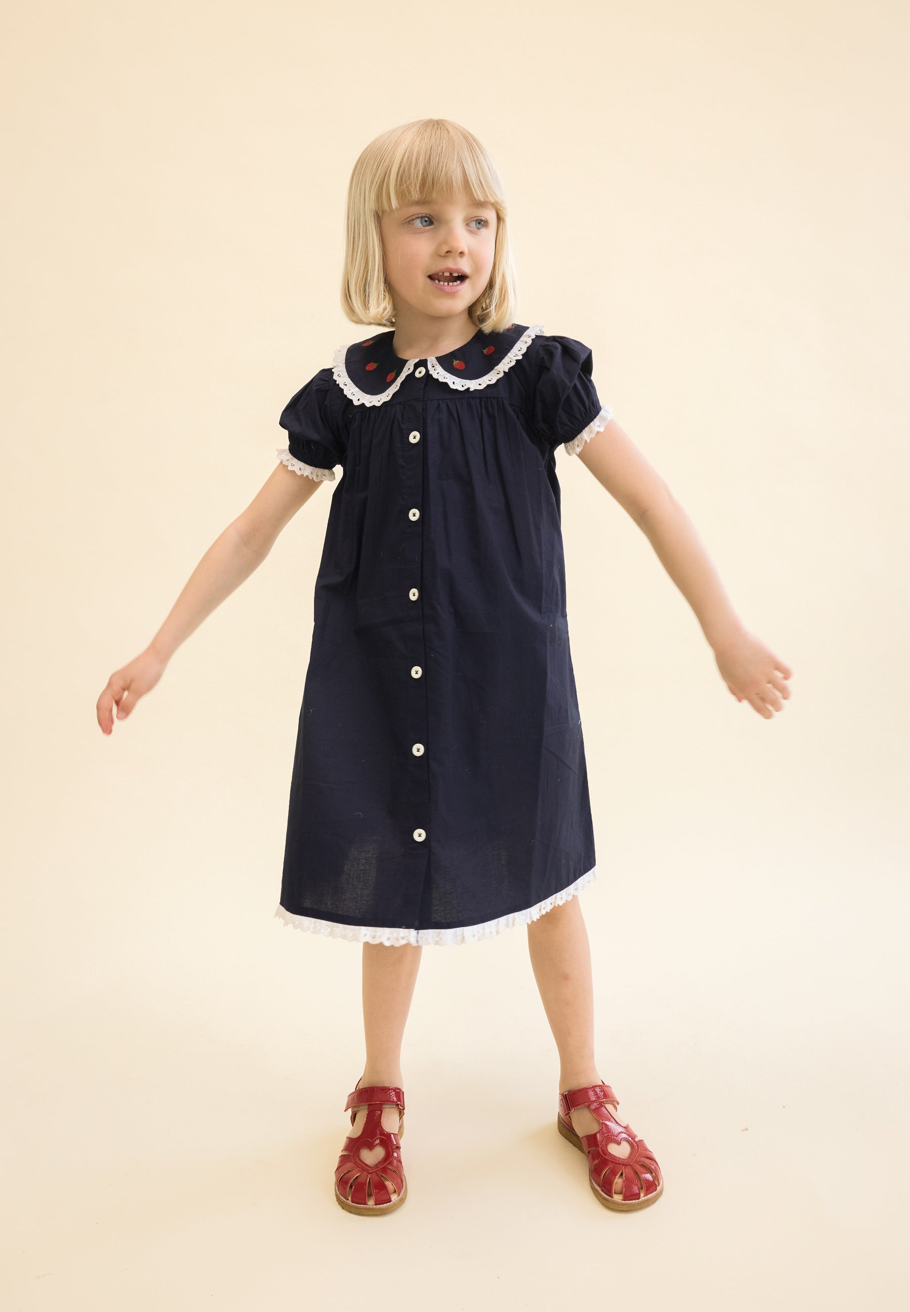 Aja Dress in Navy with strawberry embroidery, made of cotton. Has a big round collar with a ruffle hem and slightly puffed sleeves with elastic hem. Features one fabric-covered button on the back for easy dressing.