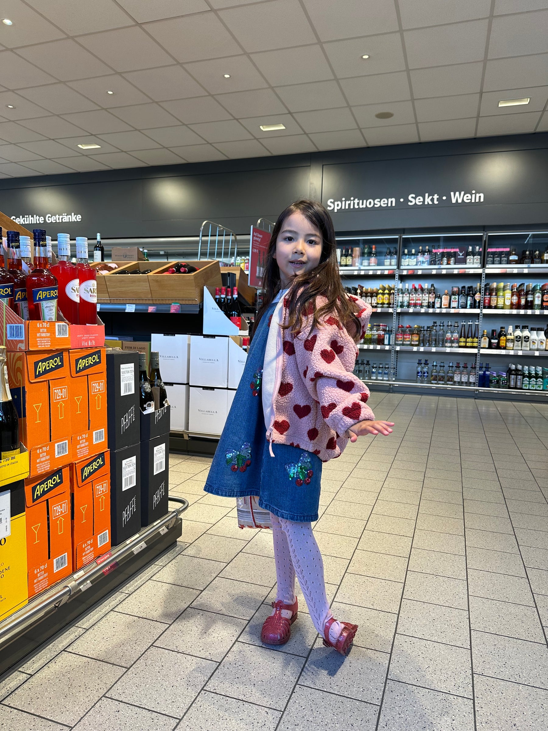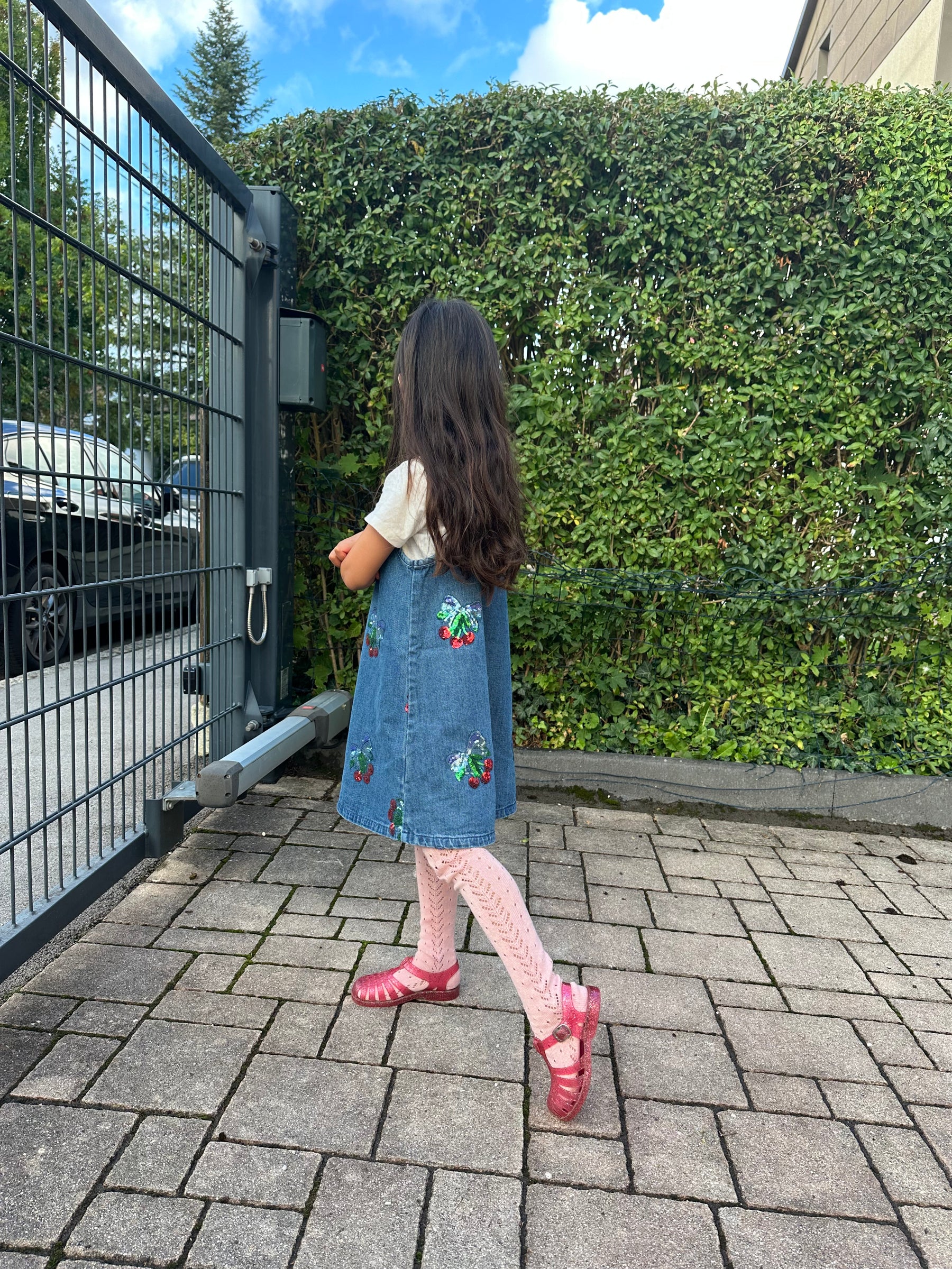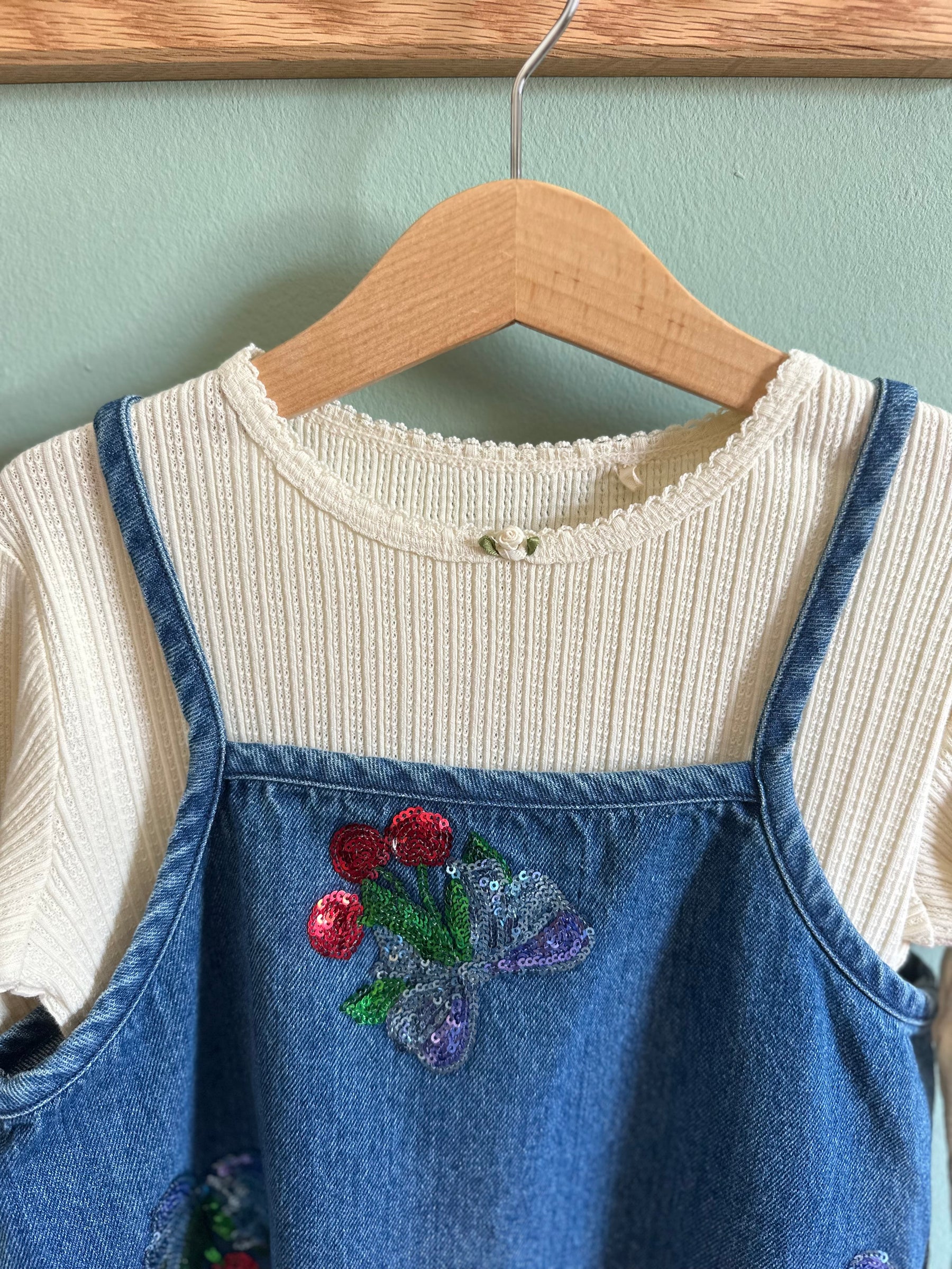 Denim strap dress with embroidered sequin cherry bows. Crafted from 100% organic cotton Washing instructions: Please wash product separately, as it may bleed colour. GOTS, Organic, certified by CU1094701