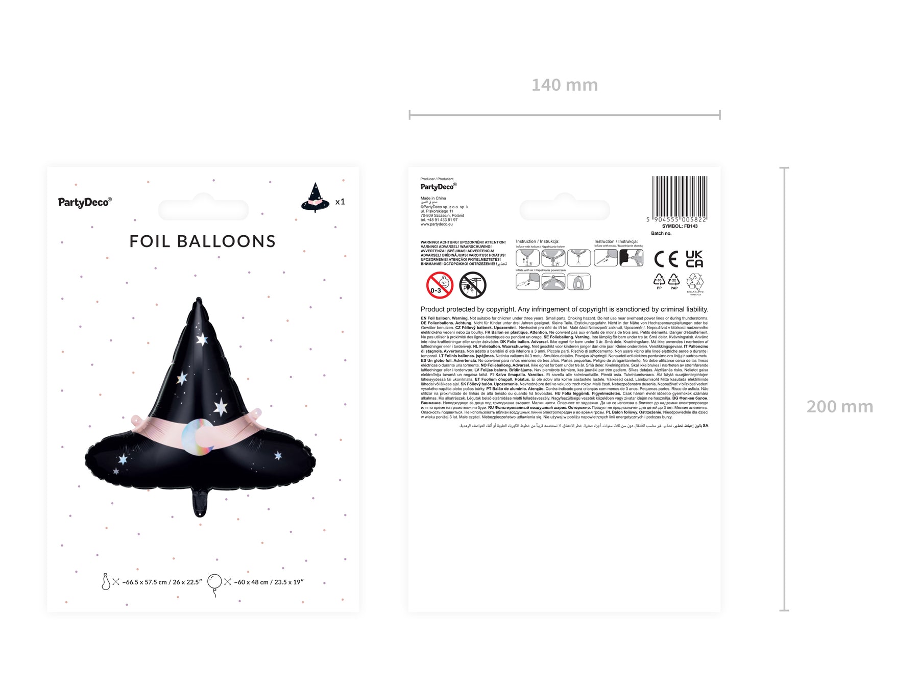 Foil balloon Witch Hat, mix of colours, size before inflation approx. 66,5x57,5 cm (26x22,5"), size after inflation approx. 60x48 cm (23,5x19"). Inflate with air and helium. Set contains a straw.