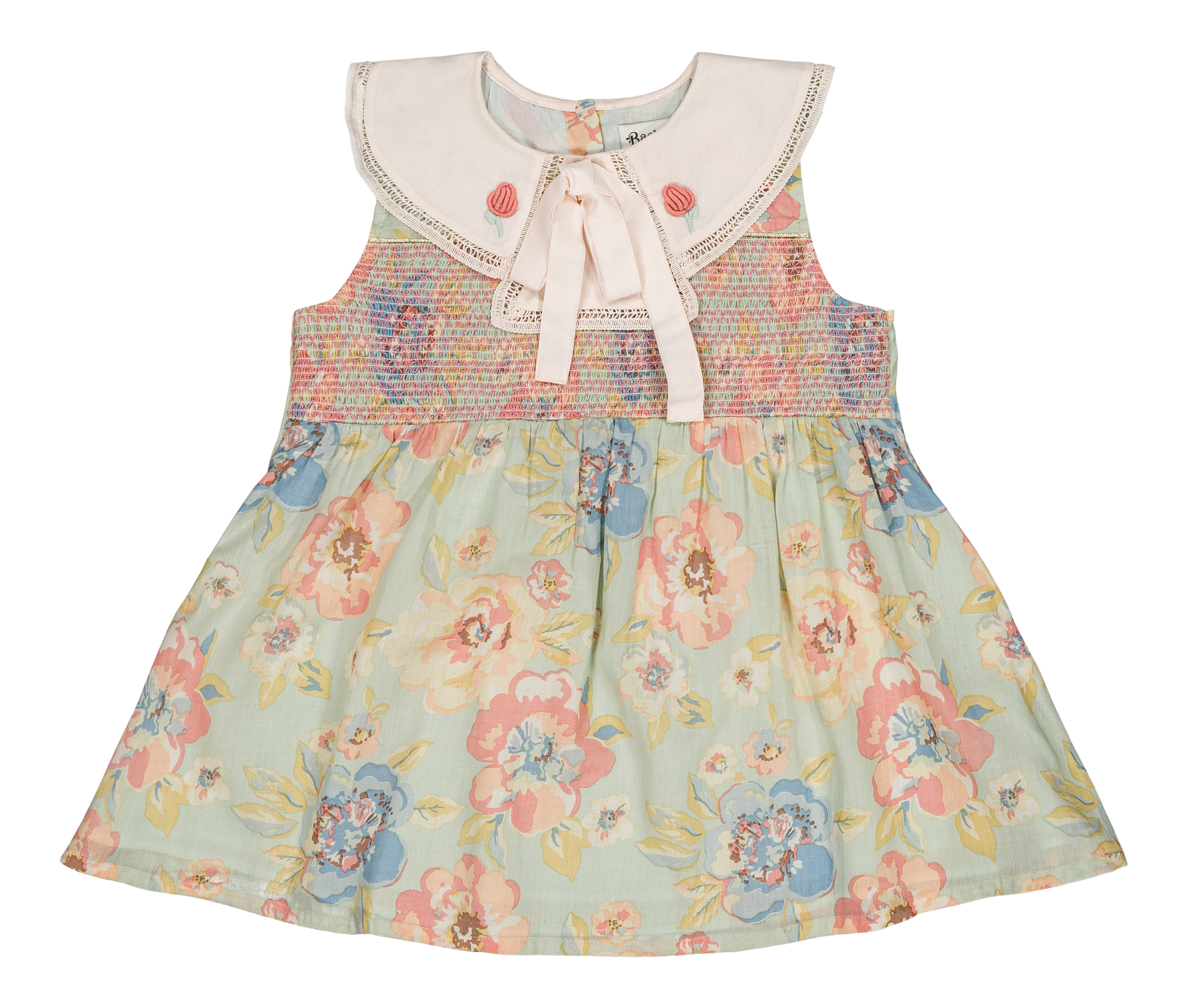 A set in organic cotton consisting of smocked shorts at the waistband and a sleeveless blouse delicately smocked on the front, with a lace trimmed collar adorned with hand embroidery and a small bow.