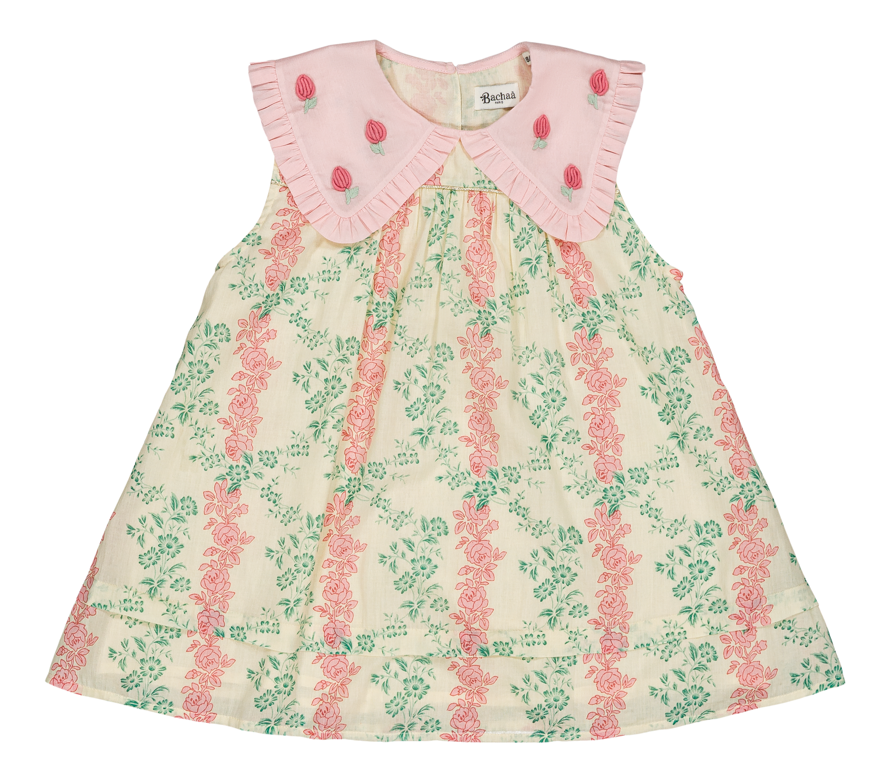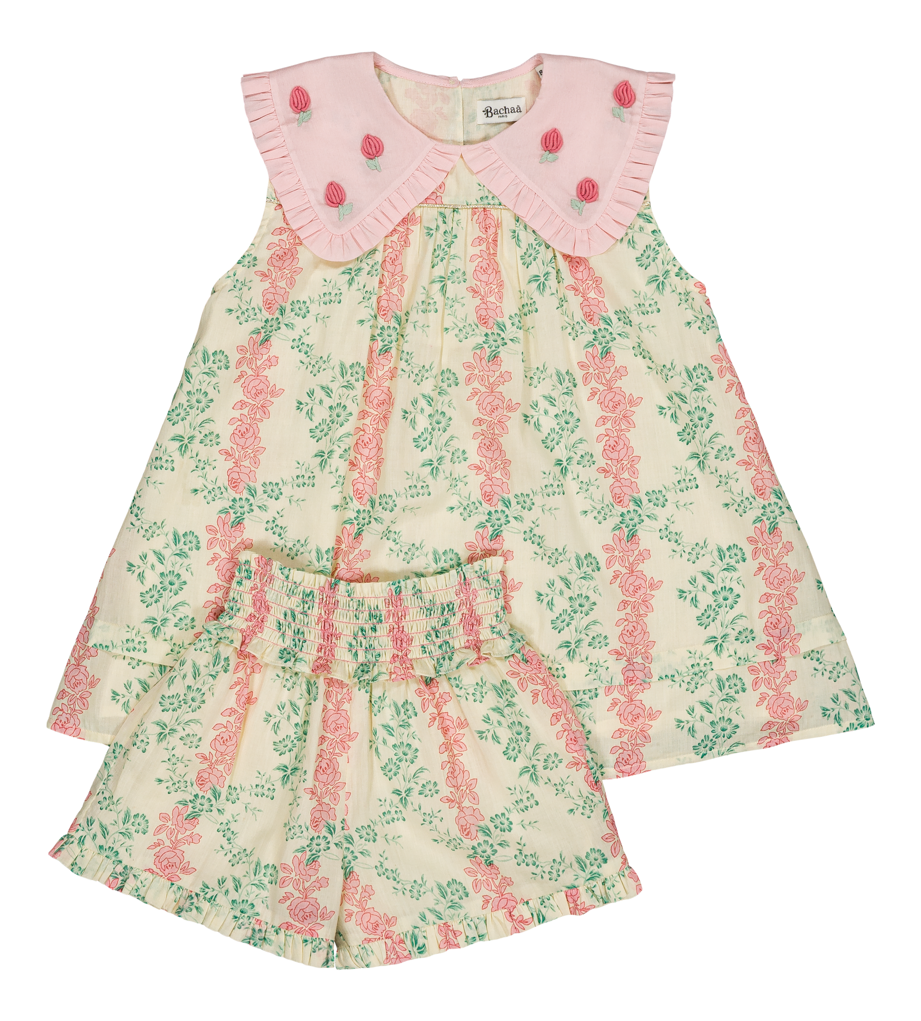 A blouse and shorts set in organic cotton with hand embroidery on the collar.