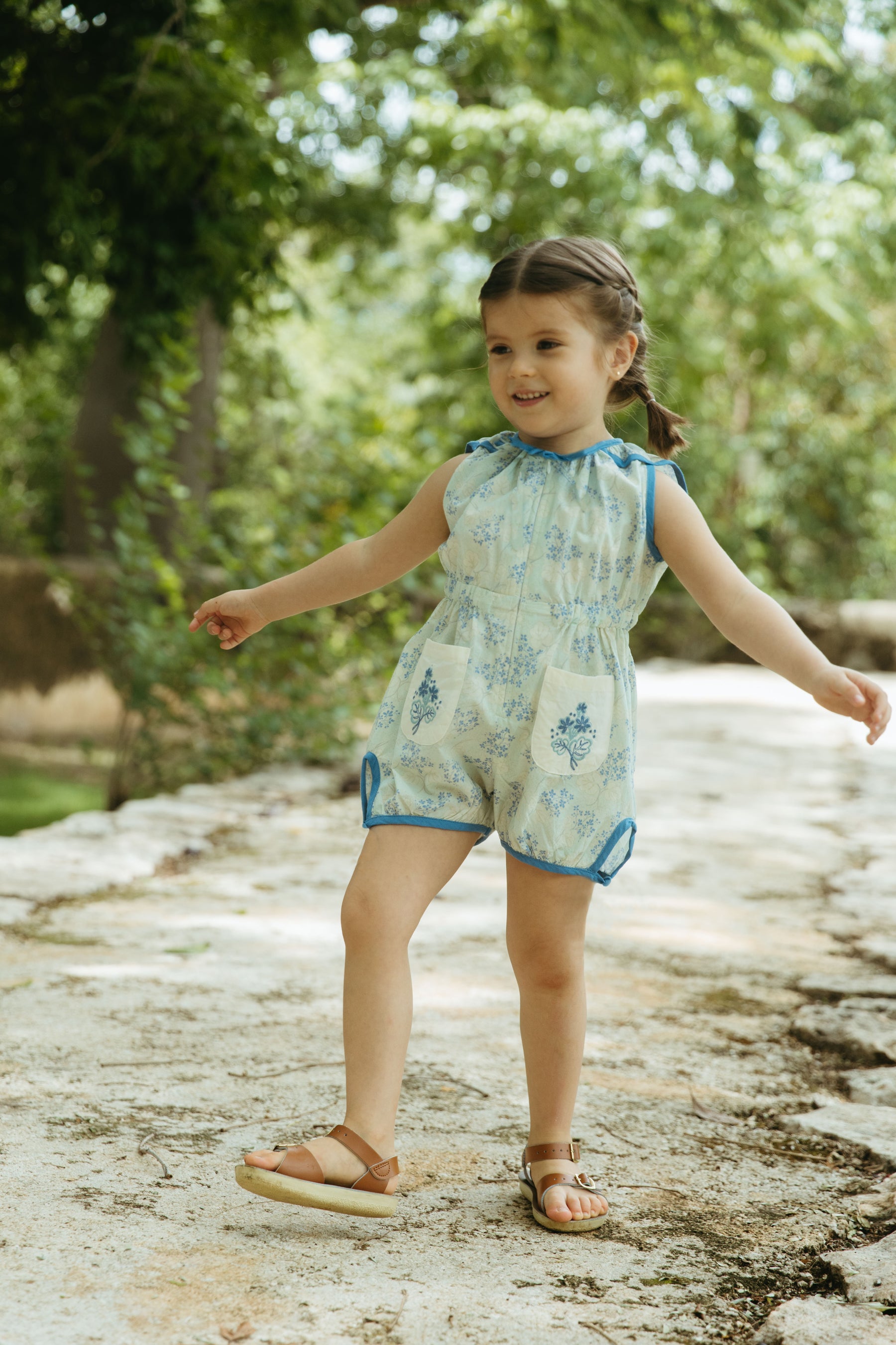 The Sun Suit Romper in our Minty Flower print is a vintage-inspired favorite made for warm-weather play. Custom drawn in our studio and printed on crisp, lightweight cotton poplin, it features a front zipper for quick changes and easy potty breaks, plus sweet embroidered pockets for a playful Lali touch. Perfect for everyday adventures, vacations, and sun-soaked days on the go.