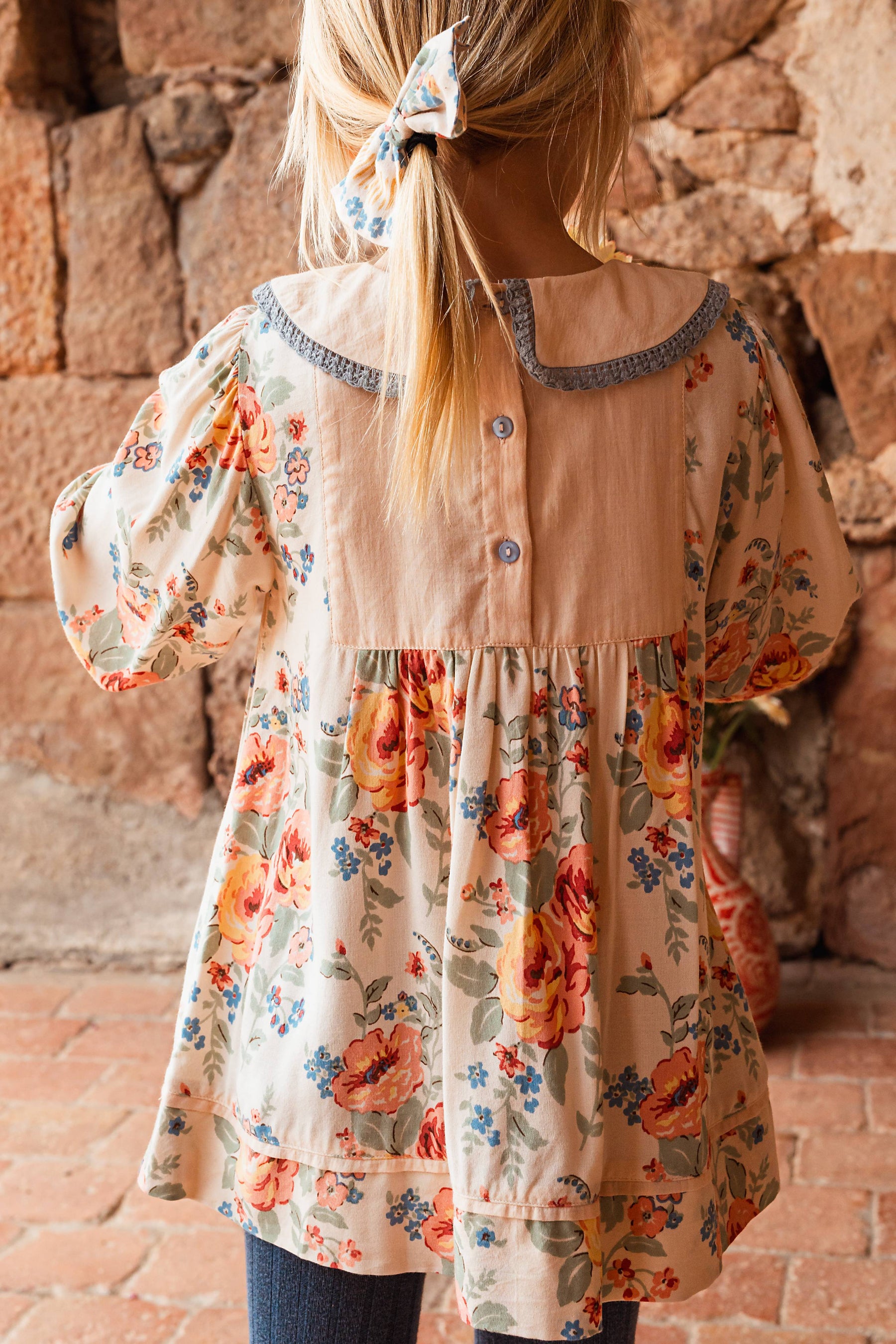 Details: Blouse, 100% ECOVERO® Viscose, Block Print, Hand embroidered and lace trimmed collar, Contrasting collar and tape, Gathers at the front and back, Long elasticated sleeves, Contrasting yoke and buttons at the back.