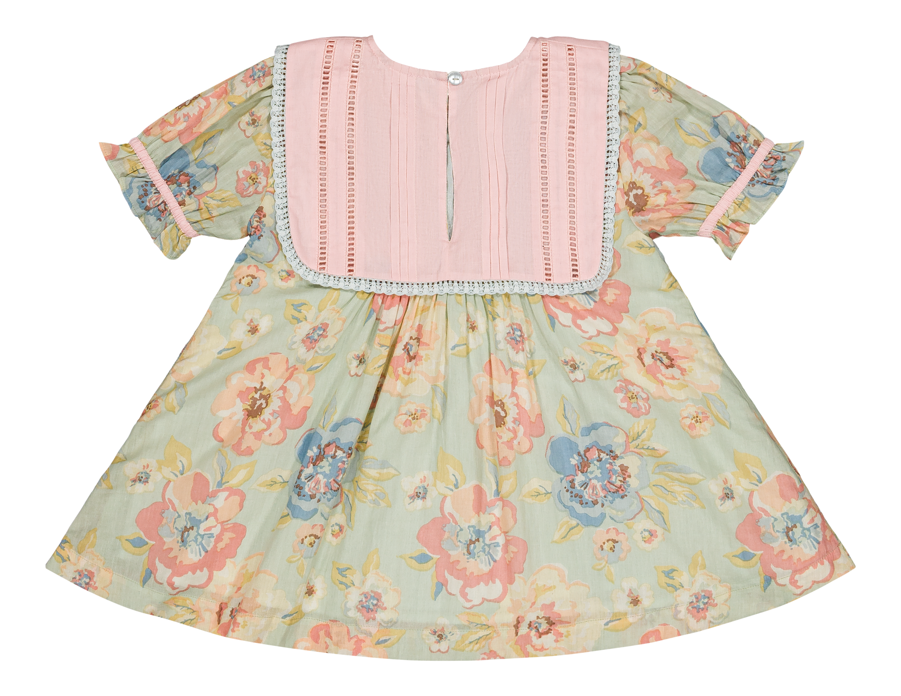 Details: Blouse, 100% organic cotton, Plain lining in organic cotton voile, Block print, Hand embroidery, pintucks and ladder lace on the collar, Golden piping, Gathers at the front and back, Elasticated short sleeves, Contrasting buttons at the back.