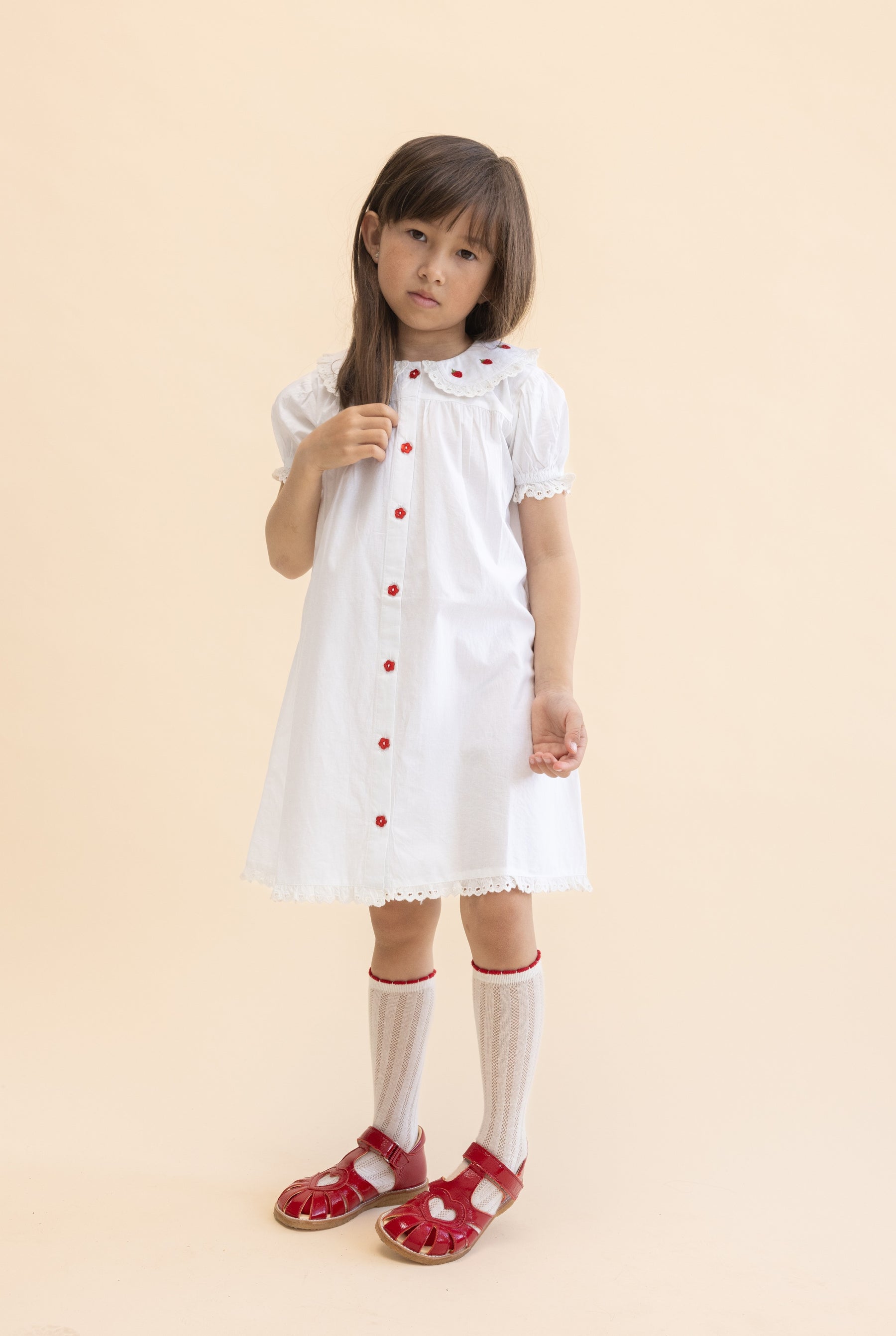 Aja Dress in Navy with strawberry embroidery, made of cotton. Has a big round collar with a ruffle hem and slightly puffed sleeves with elastic hem. Features one fabric-covered button on the back for easy dressing.