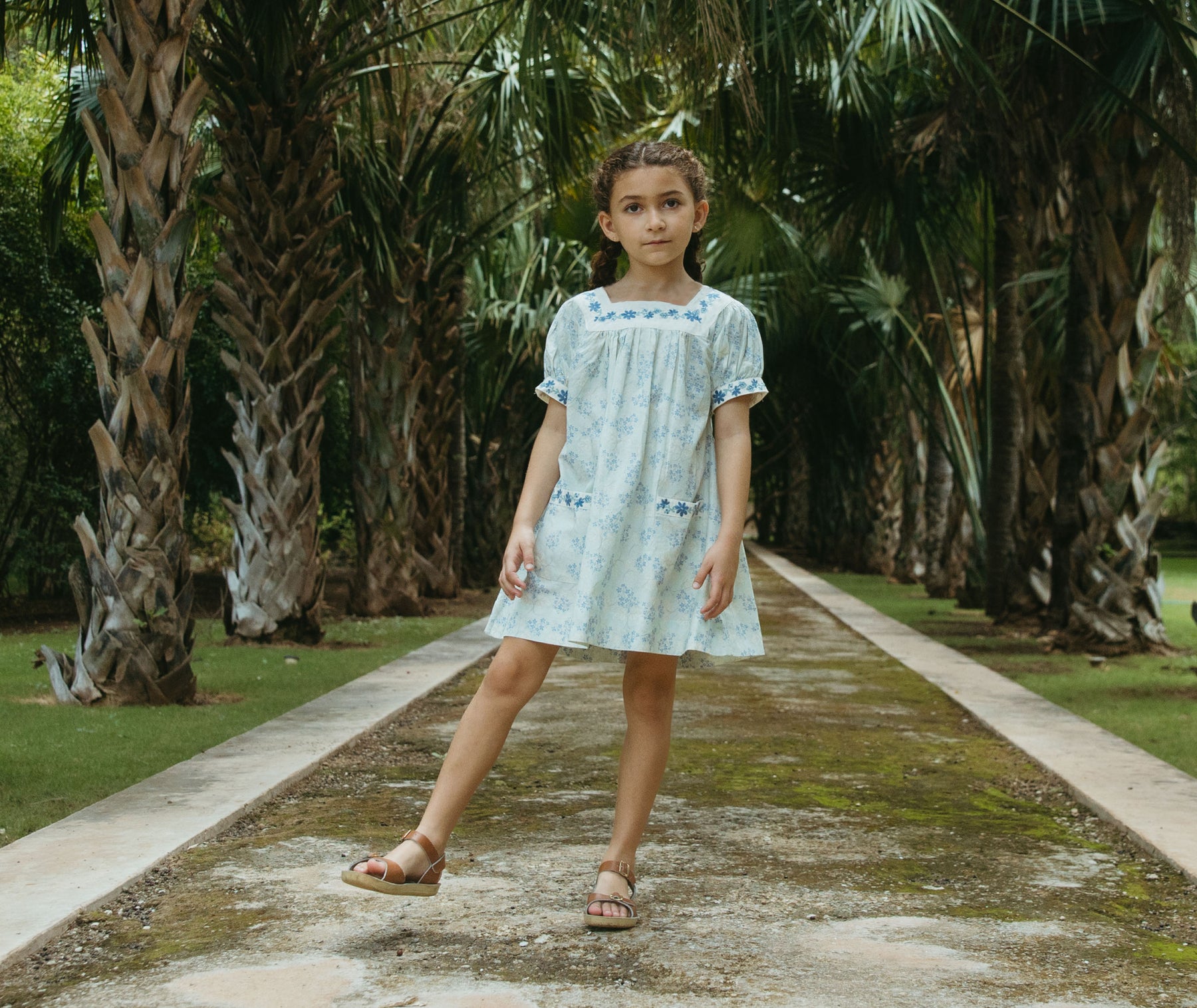 Adelle Dress is an easy summer favorite in our Minty Flower print—custom drawn in our studio and printed on lightweight cotton poplin for a crisp, breezy feel. Designed as a simple throw-on-and-go style for everyday wear, it’s finished with delicate embroidery along the neckline, sleeves, and pockets for a sweet, romantic touch. Perfect for warm days, playdates, and vacations.